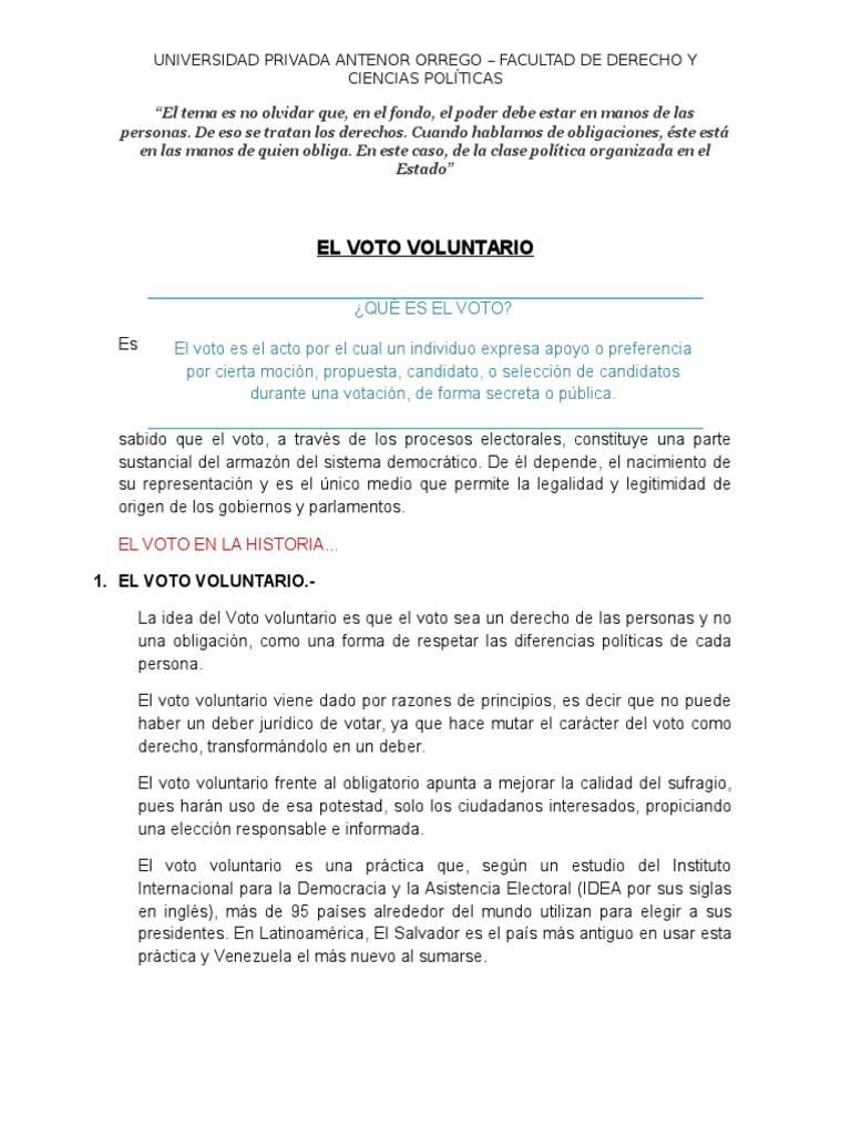 El voto es un deber cívico de cada habitante de una sociedad, todos somos responsable de quienes administran nuestro país, nuestro diario vivir depende de ello. Compulsory vote, voluntary vote, electoral sistem, méxico and brazil. Impacto del número de votantes en países que tienen el voto obligatorio o. Aunque la propuesta del voto obligatorio se hundió en colombia en el pasado mes de octubre, no son pocas las voces que escudándose en las supuestas ventajas para la democracia, siguen planteándolo como una opción, e incluso, han pedido que se incluya dentro de la agenda de la reforma al equilibrio. Chile avanza en la restitución del voto obligatorio (foto: